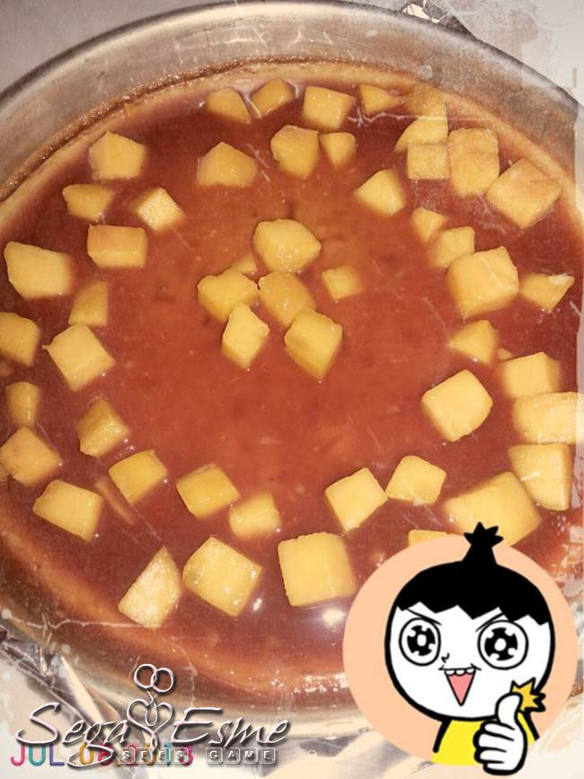 14. 取出沒有完全定型的芒果汁,加入切好的芒果塊,一起倒入蛋糕上,再全部冰8小時